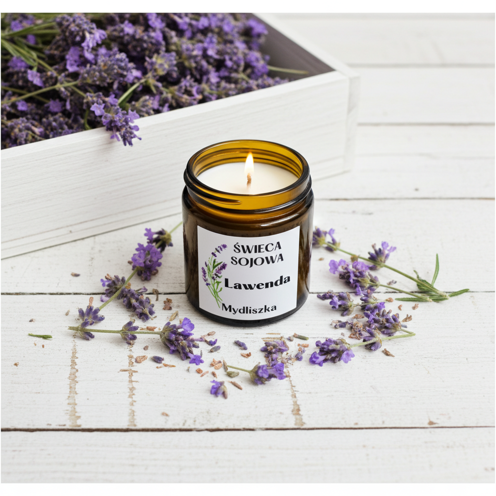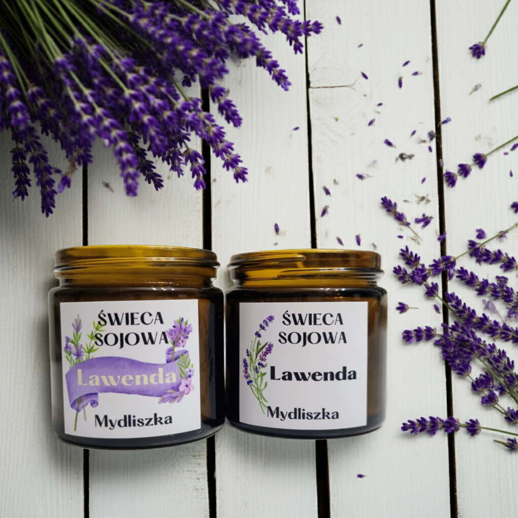 Świeca sojowa lawendowa do kupienia w trzech wielkościach słoiczków: 60ml, 120ml i 180ml. Dwie większe świece posiadają drewniane knoty.